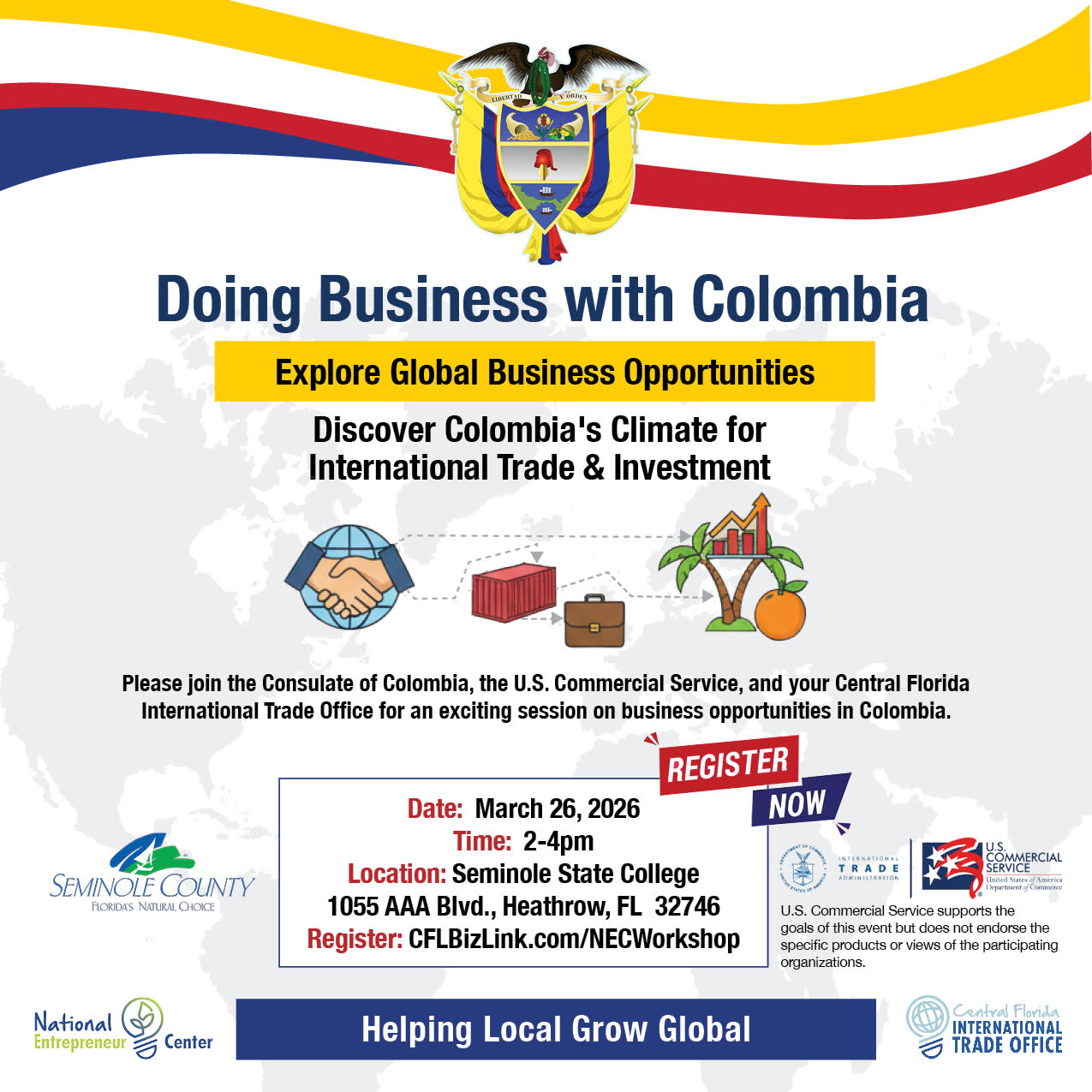 Discover Colombia's Climate for International Trade & Investment Please join the Consulate of Colombia, the U.S. Commercial Service, and your Central Florida International Trade Office for an exciting session on business opportunities in Colombia.
