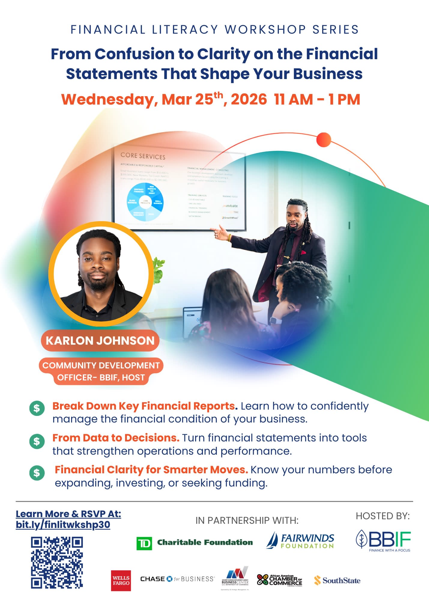 Join BBIF for a financial literacy workshop designed to help small business owners strengthen their understanding of business finances and make informed decisions. Hosted by Karlon Johnson, these virtual sessions will provide practical guidance on using financial information to support day to day operations, evaluate opportunities, and prepare for future business growth.